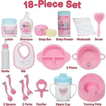 PREXTEX 18-Piece Baby Doll Accessories Set with Carrying Case - Includes Bottle, Sippy Cup, Pacifier, Bib, Hair Brush, Plates and More, Perfect for Kids, Toddlers, and Girls