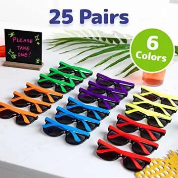 Show more Introducing the vibrant and practical pack of 25 Colorful Sunglasses, the perfect accessory for kids and adults alike! Whether you're heading to the beach, planning a fun party, or seeking a delightful classroom gift, these neon sunglasses are designed to brighten any occasion. Available in five eye-catching colors—red, orange, green, blue, and yellow—this assorted pack ensures that there is a shade for everyone!