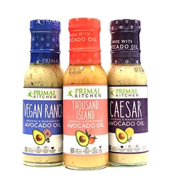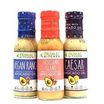 Show moreDiscover the explosive flavors of Primal Kitchen Dressing 3 Pack Sampler, a meticulously crafted trio that elevates your meals while adhering to Whole30 and Paleo guidelines. Each 8oz bottle showcases a unique and delicious dressing – the creamy Thousand Island, zesty Vegan Ranch, and bold Caesar – perfect for salads, marinades, or dipping your favorite snacks. Handcrafted with high-quality ingredients, including organic apple cider vinegar and avocado oil, these dressings not only taste fantastic but also support your health-conscious lifestyle.