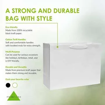 Show moreIntroducing the Prime Line Packaging 16x6x12 25 Pack Large White Gift Bags, the ultimate solution for all your gifting and shopping needs. Crafted from sturdy, 100% post-consumer waste recyclable paper, these bags are designed for both functionality and style. Each bag features a reinforced bottom that holds up to 13 pounds of your favorite items, making them perfect for weddings, parties, or retail needs. The generous dimensions of 16 inches wide by 12 inches tall and 6 inches deep ensure ample space for your gifts, goodies, or products. Each bag comes with elegant 1-inch wide cotton handles that provide comfort and durability, adding an extra touch of sophistication to your gifting experience.