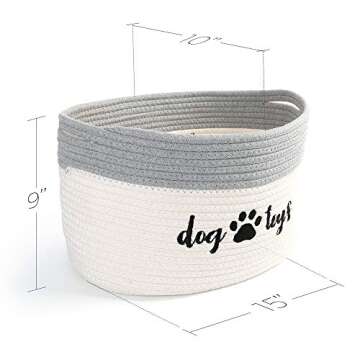 PrimePets Cotton Rope Dog Toy Basket, Small Basket with Handles, Woven Storage Bin for Dogs Pets, 15x10x9 inch Pet Basket Container Holder for Toys, White and Grey