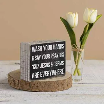 Show moreIntroducing the Primitives by Kathy Box Sign, 4-Inch by 5-Inch, Jesus & Germs, a delightful and meaningful addition to any home decor. Crafted from high-quality wood, this charming box sign features a rustic distressed paint design that gives it a cozy, vintage feel that's perfect for any space. Measuring just 4" x 5", it's compact yet impactful, making it an excellent choice for displaying on a desk, shelf, or even hanging on the wall. This unique piece serves as a gentle reminder of faith and the importance of hygiene, which is especially relevant in today's world.