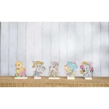 Show moreWelcome the joy of spring into your home with the vibrant charm of the Primitives by Kathy Easter Decorations. This delightful set of five wooden cutouts showcases adorable spring animals that effortlessly enhance your festive atmosphere. Measuring at a perfect 4.5 inches, these retro Easter stand-ups feature vintage artwork that evokes a nostalgic feel, making them not just decorations but conversation starters. Crafted with meticulous attention, these pieces are designed to stand proudly on any flat surface, offering a delightful display wherever you choose to place them.