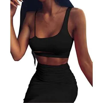 Show moreIntroducing the PRIMODA Women's Sexy Asymmetrical Spaghetti Strap Dress, a stunning two-piece outfit designed to accentuate your curves while ensuring total comfort. Made from a luxurious blend of polyester and spandex, this soft and stretchy ensemble features a chic spaghetti strap crop top paired with a form-fitting ruched bodycon maxi skirt. Perfect for making a statement at any party or night out, the dress intricately combines elegance and allure, making it a must-have addition to your wardrobe.