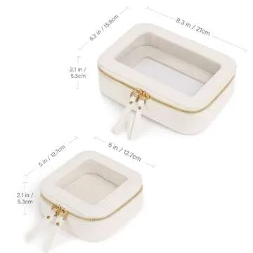 Show moreDiscover the Prite Clear Makeup Bag Set, your ultimate travel companion designed for the modern woman who values both style and functionality. This stunning portable clear makeup bag not only keeps your cosmetics neatly organized but also enhances your travel experience with its chic waterproof design. Crafted from premium vegan leather, this makeup bag measures 8.3'' x 6.2'' x 2.1'' and offers ample storage for your complete beauty ensemble—from makeup brushes and palettes to skincare essentials and everyday items. The luxurious beige color and elegant gold zipper add a sophisticated touch, ensuring you always travel in style.
