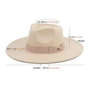 Show moreIntroducing the stunning Pro Celia Big Wide Brim Women Fedora Hat in an elegant Peach-Rice color! This fashionable wide-brim hat features a luxurious feel, designed with a unique large brim measuring 9 cm (3.5 inch) that effortlessly frames your face while providing ample sun protection. Whether you're dressing up for a special occasion or heading out for a casual outing, this hat elevates your ensemble with chic sophistication. Crafted from a premium blend of 65% polyester and 35% wool, it promises durability and comfort throughout wear. Plus, the adjustable strap inside allows you to customize the fit for ultimate ease, making it perfect for any head size between 7 and 7 3/8 (58 cm head circumference).