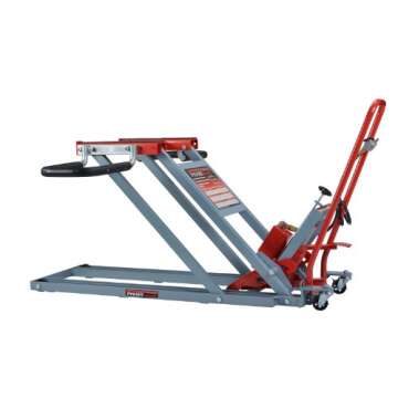 Show moreThe Pro-LifT T-5501 Grey Air Actuated Lawn Mower Lift is the ultimate solution for lawn care enthusiasts and professionals alike. Designed with versatility and convenience in mind, this innovative product not only raises your riding mower to a comfortable working height, but it also doubles as a reliable maintenance stand. With a robust saddle weight capacity of 750 pounds and a wheel bracket capacity of 500 pounds, this lift can handle a wide range of lawn mowers with ease. The hydraulic foot pump operates a powerful 6-ton bottle jack, ensuring that lifting is both straightforward and efficient.