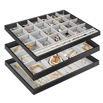 Show moreElevate your jewelry organization with the ProCase 3 Stackable Jewelry Trays Organizer Set. This elegant set includes three versatile trays designed to accommodate all your jewelry needs. The first tray features 24 compartments and a ring holder, perfect for earrings and rings. The second tray offers 12 larger compartments, ideal for bracelets and watches. The third tray comes with 10 hanging hooks, making it perfect for necklaces. Each tray measures 13.8" x 9.5" x 1.2", with removable dividers to customize your storage. Crafted from sturdy composite board and wrapped in premium velvet fabric, these trays protect your jewelry from scratches while adding a touch of luxury to your space. Stackable design ensures a perfect fit on your vanity or in your drawer, keeping your jewelry organized and easily accessible. Whether for personal use or as a gift, this set is a must-have for any jewelry enthusiast.