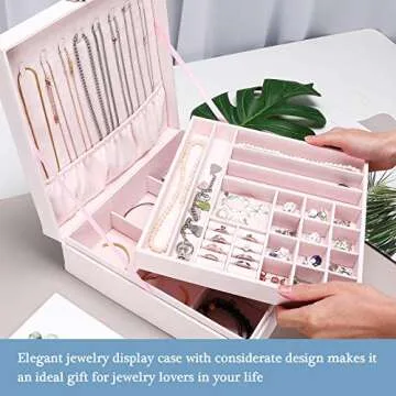 ProCase Velvet Jewelry Box Organizer for Women, 2 Layer Jewelry Display Storage Holder Case for Necklace Earrings Bracelets Rings -Pink