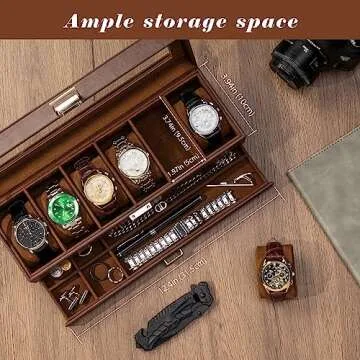 Show more Introducing the ProCase Watch Box for Men, an exquisitely crafted 6-slot watch display case designed to elevate your wristwear organization. Boasting a sleek espresso PU leather exterior and a soft lining, this elegant storage solution combines style and practicality. Perfect for keeping your watch collection admirably organized, it features a clear glass lid that not only protects your cherished timepieces from dust and scratches but also allows for a stunning display of your collection. Whether you're a watch enthusiast or seeking the perfect gift, this watch box is a must-have.