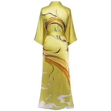The robe showcases a beautiful phoenix design, expertly handprinted to create vibrant visuals that are sure to turn heads. The professional french seam detailing ensures durability while enhancing the robe's luxurious appearance, reflecting light for a striking effect at every angle. This long, flowing garment is designed to grace your silhouette with its elegant drape that cascades all the way down to your ankles.