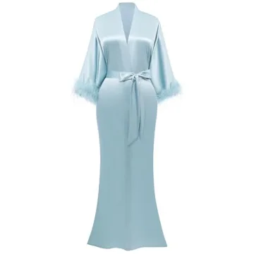 PRODESIGN Satin Kimono Robe Long Silky Bath Robe with Ostrich Feather Trim Sleepwear Wedding Bridesmaid Robe