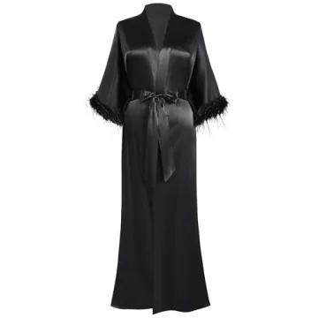 PRODESIGN Satin Kimono Robe Long Silky Bath Robe with Ostrich Feather Trim Sleepwear Wedding Bridesmaid Robe