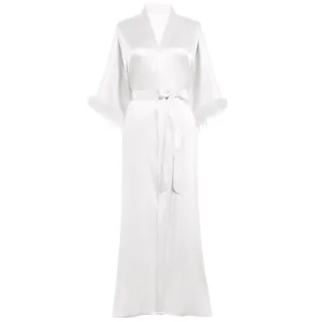 PRODESIGN Elegant Satin Kimono Robe with Ostrich Feather Trim for Bridal & Spa Use