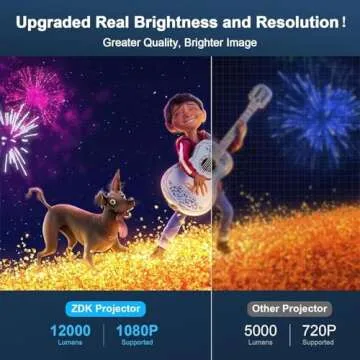 Show more Experience cinematic brilliance right in the comfort of your own home with the Projector With WiFi and Bluetooth by ZDK. This portable powerhouse combines modern technology with user-friendly features, making it an essential device for movie lovers, gamers, and sports fans alike. Weighing just 1.10 pounds and measuring 6.10 x 4.57 x 2.68 inches, this mini projector is incredibly lightweight, allowing you to effortlessly carry it in your handbag wherever you go. Whether you want to enjoy large-scale home theater setups, outdoor movie nights, or captivating game sessions, this projector delivers with a stunning brightness of 12000 lumens that ensures clear visibility even in well-lit environments.