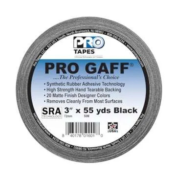 Show more The ProTapes Gaffer's Tape is a versatile and premium quality tape that takes on any task with ease. Measuring 3 inches wide and 55 yards long, this 11-mil thick black matte cloth tape is specifically designed to cater to a variety of applications, including labeling, temporary securing, and sealing. Its exceptional rubber adhesive allows it to conform well to irregular surfaces, ensuring a reliable hold no matter the circumstance. You can trust that this gaffer's tape will stand the test of time, as it is engineered to resist abrasion, thereby enhancing its durability and performance in demanding conditions.