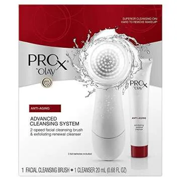 System includes 2-speed, water-resistant Facial Cleansing Brush, Cleansing Brush Head, Exfoliating Renewal Cleanser (0.68 fl. oz.) and 2 AA batteries