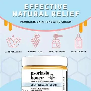 Show more Discover soothing relief for your skin with the PSORIASIS HONEY Skin-Renewing Cream. Specially formulated to combat the discomfort associated with psoriasis and eczema, this cream contains a powerful 1.8% salicylic acid concentration that effectively alleviates redness and irritation while helping to regulate skin turnover. Dermatologist-tested for safety and efficacy, this cream promises to provide a refreshing touch and restore the natural beauty of your skin, leaving it feeling rejuvenated and itch-free.