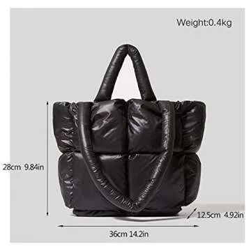 Show more Introducing the ultimate blend of style and functionality, this chic shoulder bag crafted from premium nylon and filled with down cotton is designed not just for utility but for fashion as well. With dimensions of 14.2x4.9x9.8 inches (36 x 12.5 x 28 CM), it offers ample space without being bulky, making it the perfect companion for your bustling lifestyle. The main zipper compartment is equipped with an inner zipper safety pocket to keep your essentials secure, ensuring that you can carry what you need without a worry.