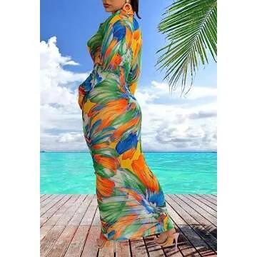 PuiLean Women's Sexy Summer Sheer Mesh Dresses Button Down Long Sleeve See Through Swimwear Maxi Dress