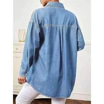 Pulcykp Women Casual Lapel Single Breasted Denim Shirts Coat Spring Loose Solid Button Jean Jacket Blue L