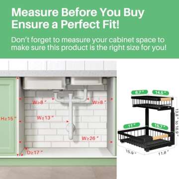 Show moreIntroducing the ultimate solution for home organization with the **Pull out Cabinet Organizer**! This 2-tier under sink organizer measures an impressive 11.8"W x 15.9"D x (13.8"-16.9")H, providing ample space for your taller bottles, cleaning supplies, and other essentials. Designed to maximize efficiency and storage capacity, it's ideal for decluttering your kitchen or bathroom cabinets. Before making your purchase, be sure to check your cabinet dimensions to ensure a perfect fit!