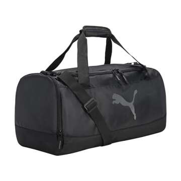Show moreDiscover the perfect blend of style, functionality, and durability with this remarkable duffel bag from the renowned brand, Puma. Crafted with an impeccable attention to detail, this bag is designed to cater to the needs of active individuals and travelers alike. The adjustable and removable shoulder strap ensures comfort and versatility, allowing you to carry it in a way that suits your needs. With a sleek dark color scheme, this bag radiates a modern aesthetic that complements any outfit.