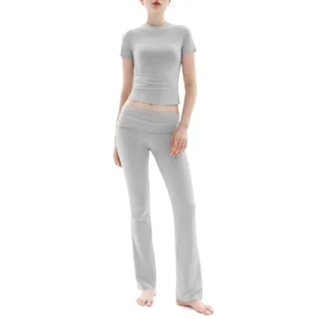 The sophisticated design showcases a classic crew neck and short sleeves, ensuring timeless appeal. The slim fit of the shirt pairs perfectly with the fold-over flare pants, enhancing your curves gracefully while offering maximum comfort. Enjoy a flattering silhouette that boosts your confidence, whether you're doing errands or enjoying a cozy night in. This set is versatile enough to be dressed up with a jacket and chic sneakers, or worn casually with your favorite jeans.