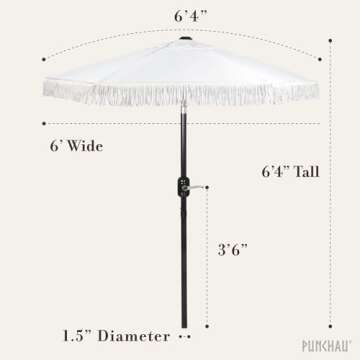 Show moreTransform your outdoor oasis with the Punchau Boho Patio Umbrella, an exquisite blend of style and functionality. This chic umbrella boasts a stunning tassel fringe, adding a touch of bohemian elegance to your patio, balcony, or garden. Measuring 6 feet in height and 5 feet 9 inches in diameter, it’s the ideal companion for small dining tables or cozy outdoor nooks. The rust-proof pole and durable, fade-resistant polyester fabric ensure that this umbrella not only looks good but is ready to withstand the elements, making it a stylish yet practical addition to your outdoor experience.