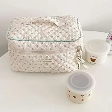 Show more Introducing the ultimate companion for beauty enthusiasts - our charming floral makeup bag! Crafted by a brand renowned for its commitment to quality, this bag not only meets your storage needs but also adds a touch of elegance to your beauty regime. Made of premium cotton fabric, it is soft to touch and incredibly durable, ensuring it withstands everyday wear and tear. The delightful quilted rhombus design enhances its aesthetic appeal, making it a stylish choice for any makeup lover.