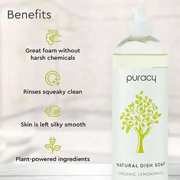 Puracy Dish Soap, Organic Lemongrass, Hypoallergenic Non-Drying Natural Liquid Detergent for Hand Washing Dishes, 16 Fl Oz (6-pack)