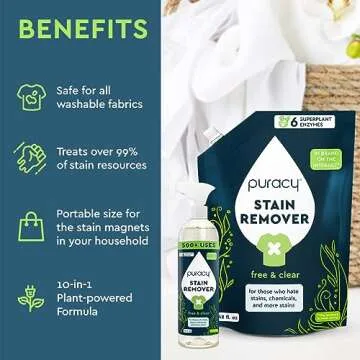 Puracy Stain Remover Cleaning Spray - Enzyme-Powered Stain Remover Spray As Seen on TikTok, Natural Travel Stain Remover for Clothes (Free & Clear, 48 fl oz + 16 fl oz)