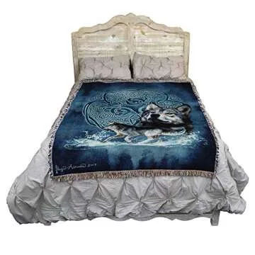Show moreIntroduce a touch of elegance and comfort into your home with the Pure Country Weavers Celtic Wolves Blanket by Brigid Ashwood. This stunning woven heirloom combines artistic beauty and practical functionality, making it an ideal gift for your loved ones. Crafted from a blend of virgin and recycled cotton, this versatile blanket not only showcases a captivating design of Celtic wolves but also embodies a commitment to sustainability and quality. Measuring a generous 72 x 54 inches, it's perfect for use as a cozy throw on your couch, a chic bed topper for both full and queen sizes, or even as a breathtaking wall tapestry. Your friends and family will treasure the exceptional craftsmanship and unique imagery that speaks to both art and comfort.