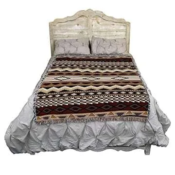Rich in colors and featuring traditional fringed edges, this blanket draws inspiration from authentic Native American Indian tribal rug designs, bringing a touch of history into your home. It's not just a throw; it's a versatile piece that can serve as a cozy couch accessory, a wall hanging tapestry, or even a lovely bed topper, perfect for full or queen-size beds.