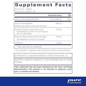 Show moreIntroducing the Pure Encapsulations Cortisol Calm, a revolutionary supplement meticulously designed to promote optimal cortisol health and enhance relaxation. This powerful formula uniquely combines ashwagandha, renowned for its stress-reducing properties, with L-Theanine, which promotes a calm state of clarity without sedation. With 120 easy-to-swallow capsules, you can conveniently support your body’s natural stress response and enjoy restful sleep each night. The formulation is crafted with care, ensuring it is free from common allergens, GMOs, and unnecessary additives, making it a trustworthy choice for anyone seeking to enhance their well-being.