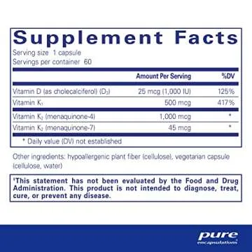 Show more Introducing the Pure Encapsulations Synergy K, an exceptional bone supplement designed to provide optimal support for your bone health and overall wellness. This carefully formulated product combines essential vitamins K1, K2, and D3, which work synergistically to enhance bone strength and promote calcium utilization. Each capsule contains a potent dose of 25 mcg of cholecalciferol (vitamin D3), which is vital for the maintenance of robust bones and teeth. Crafted with the highest quality in mind, this supplement is not only gluten-free and non-GMO but is also devoid of common allergens and artificial ingredients, making it a safe and effective choice for individuals seeking to improve their bone and vascular health.