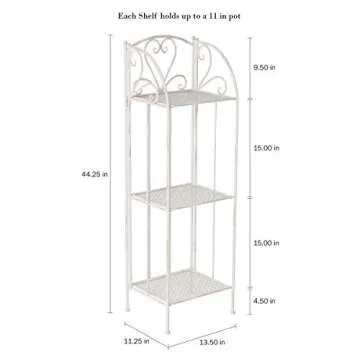 Show more Elevate your home and garden aesthetics with the Pure Garden Plant Stand, a stunning 3-Tier Vertical Shelf designed to offer both functionality and beauty. Crafted with a vintage charm, this folding plant stand features a striking wrought iron-inspired design complete with intricate laser cut scrollwork. Its antique white powder-coated finish not only adds a classic touch but also provides resistance against rust and corrosion, ensuring your display will endure the elements. The convenient folding mechanism allows for easy storage when not in use, making it an ideal addition for any plant lover.