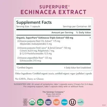 Show more Introducing the ultimate natural defense: the IMMUNE SUPPORT SUPPLEMENT by The Synergy Company. This remarkable product delivers comprehensive support for your immune system, made with certified organic triple extracts from Echinacea angustifolia and purpurea. Each bottle contains 60 capsules packed with 450 mg of high-potency immune support per serving, perfectly designed to enhance your body's defenses.