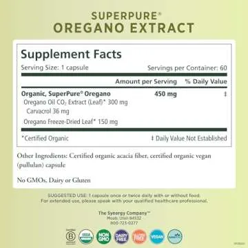 Show moreIntroducing the remarkable PURE SYNERGY SuperPure Oregano Extract, your ultimate ally in achieving peak health! Crafted by The Synergy Company, this supplement features a potent blend of 100% organic oregano oil extract and whole leaf, presented in convenient capsules designed for easy swallowing. Each bottle holds 60 capsules infused with nature’s best, ensuring that you receive the powerful benefits of carvacrol, a crucial bioactive compound renowned for its extensive health advantages.