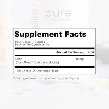 Show more Discover the extraordinary benefits of Pure TheraPro Rx Bio Boron, a premium dietary supplement specifically designed to enhance your health and well-being. Formulated with Albion's Bororganic Glycinate, this product ensures maximum absorption and bioavailability, making it a superior choice for anyone looking to improve their essential nutrient intake. Boron is a vital trace mineral known for its ability to support optimal bone metabolism, immunity, and nervous system health. Each capsule is crafted to provide you with 10mg of Boron, crucial for maintaining robust hormone functions, and is a powerful cofactor for Vitamin D3 and Magnesium, enhancing Calcium absorption.
