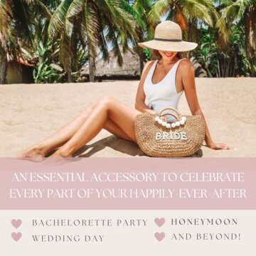 PureRejuva Bride Beach Bag- Handwoven Straw –Rhinestone & Pearl Letters – Bachelorette Beach Tote- Honeymoon Bag