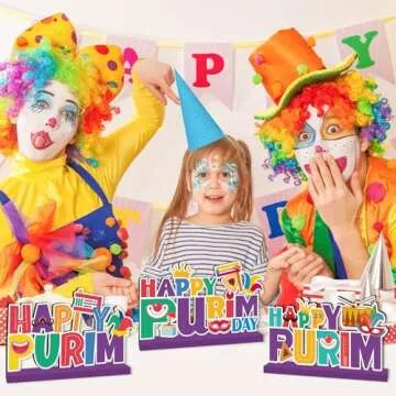 Purim Decorations Wood Table Centerpieces 3pcs Happy Purim Day Decorations Jewish Holiday Party Table Decor Purple Carnival Mask and Clown Pattern Wood Tabletop