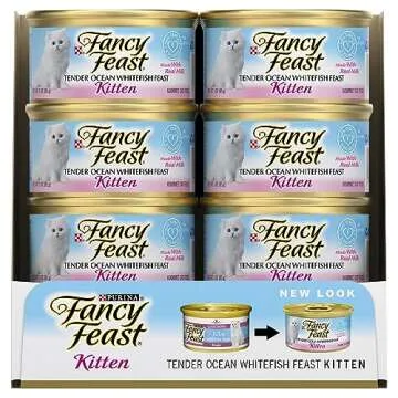 If you're looking for the ideal diet for your growing kitty, look no further! Introducing Fancy Feast Kitten Tender Ocean Whitefish Feast Wet Cat Food. This product comes in a convenient pack of twenty-four 3-ounce cans, providing a delicious and nutritious option for your beloved feline. Enriched with essential vitamins and minerals, each can is 100% complete and balanced, ensuring your kitten gets the nourishment they need for healthy growth and development.