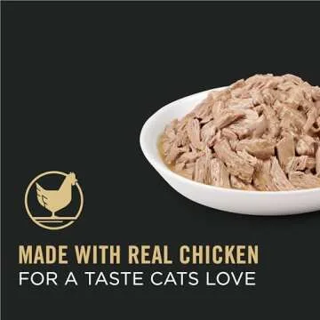 Show more Introducing Purina Pro Plan Complete Essentials High Protein Cat Food Gravy, thoughtfully crafted to promise your feline companions a taste experience they can't resist! This premium wet cat food is made with real chicken, ensuring your cats enjoy delicious meals packed with flavors they love. The convenient pack of 24 cans, each containing 5.5 oz, is designed for both meal prepping and satisfying your cats' hefty appetites.