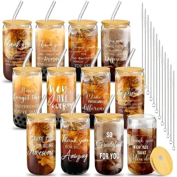 Show moreIntroducing the ultimate gift that combines practicality and thoughtful design – our delightful set of 12 can-shaped glass cups! Perfectly crafted by a trusted brand, each set comes complete with a coffee glass, a reusable straw, and a handy straw brush for easy cleaning. Made from high-quality glass, these cups are not only visually stunning but also incredibly resilient, effortlessly withstanding temperature changes without the worry of breakage. Each cup is adorned with motivational messages such as 'Thank You for Being Awesome', allowing you to express your gratitude in a unique and personal way.