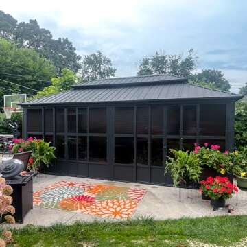 Show morePURPLE LEAF 12' X 20' Sunroom Permanent Hardtop Gazebo Solarium is the perfect outdoor solution for those who wish to extend their living space while enjoying the beauty of nature. Crafted from galvanized steel, this stunning sunroom not only provides exceptional protection against harmful UV rays but also resists rust, ensuring longevity and durability. Its innovative double-layer design offers superior heat insulation and ventilation, adapted to withstand all weather conditions, making it a truly versatile addition to any patio, deck, or backyard. The sturdy aluminum frame showcases aesthetic beauty while providing robustness; the powder-coated finish guarantees a rust-free experience, maintaining its allure through seasons of outdoor use.