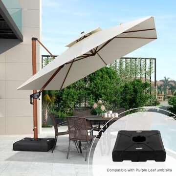 Why You Will Love This Product: With the PURPLE LEAF Offset Umbrella Base, experience peace of mind knowing your umbrella will remain stable no matter the weather. Its sleek, minimalist design provides both functionality and a stylish aesthetic to your outdoor setup, enriching your relaxation with a protective shade as well as admiration from friends and family. Embrace the comfort of outdoor living while reducing worries about your umbrella; this base is not just a purchase, but an investment in countless enjoyable moments outdoors.