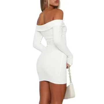 Purple Pocket Women's Off The Shoulder Long Sleeve Dresses Casual Fall Sexy Bodycon Ribbed Cocktail Mini Dress White L