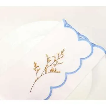PurpleEssences Scalloped Embroidery Cloth Napkins Table Decor Spring Summer Easter 100% Cotton Set of 4-18 x 18 inch - White - Edges - Light Blue