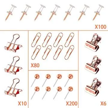 Push Pins Binder Clips Paper Clips Map Tacks Sets, 5 Styles 396 Pcs Rose Gold Pack for Office, School and Home Supplies (Pin and Clips)
